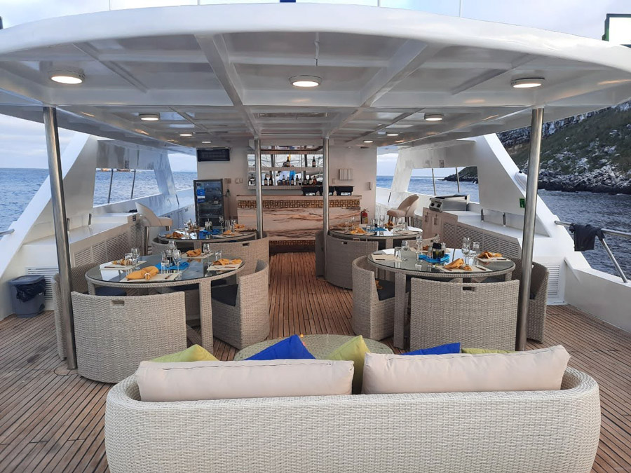 Itineraries to the Galapagos Islands are seven nights in duration, departing Baltra on a Saturday. The itinerary includes Wolf and Darwin islands and up to four dives a day are offered. In addition, guests have the opportunity to encounter marine iguanas at Cabo Douglas, mola mola at Vicente Roca as well as sea lions and eagle rays at Cousins Rock. The itinerary complies with the diving excursion regulations of the Galapagos National Park and also includes a land excursion to see the giant tortoises during a hike in the Santa Cruz Highlands on the final day.