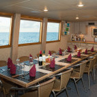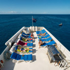 On board, the flybridge has an awning covered area with plenty of seating, a BBQ, wet bar and helm station; a popular place for guests to relax after a dive. The main deck features a large air-conditioned salon where breakfast and dinner are served as well as an entertainment centre and the galley. The aft half of the deck is dedicated to diving and its here that all the facilities can be found; lockers, camera table, recharge station, rinse tanks, showers and a bathroom. Large stairways lead down to the dive deck which features two ladders for easy access to the water.