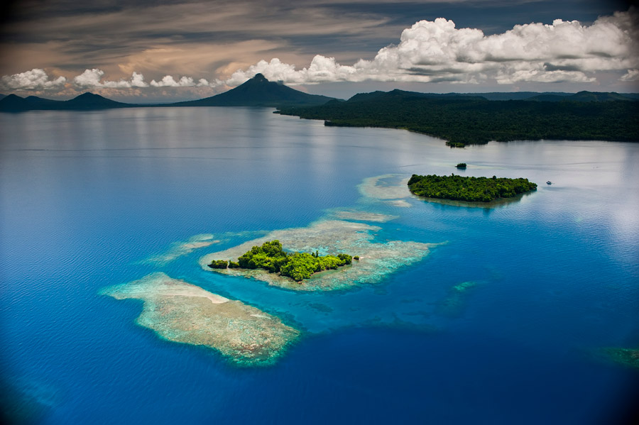 A chain of dormant volcanoes form the scenic boundaries of Kimbe Bay, on the north side of the island of New Britain, encompassing hundreds of submerged reefs and more than a dozen islands.