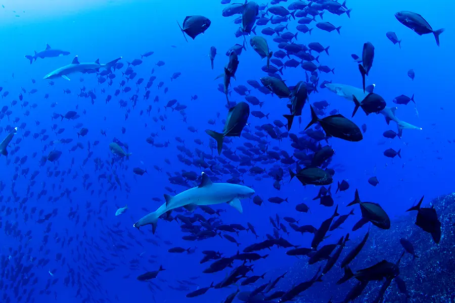 Roca Partida – Small in size but bursting with adventure! This iconic dive site features dramatic vertical walls alive with marine life, creating an underwater metropolis you'll never forget. Swim alongside massive schools of fish, giant manta rays, playful dolphins, and an array of sharks—including silver tip sharks, silky sharks, grey sharks, and hammerhead shark species. Roca Partida is definitely one of the most iconic dive sites in the eastern Pacific.
