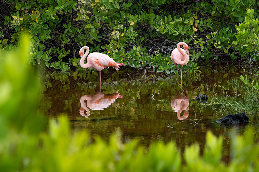 During your time on Isabela, you snorkel Los Tuneles (Cabo Rosa), where the lava topography is stunning, and the highlight in the water are the playful sea lions. If possible, the guide will attempt to spot the small colony of penguins, often resting side by side with blue-footed boobies. Also, enjoy a guided tour of the Isabela Breeding Centre and Wetlands. The lush wetlands are home to diverse flora and fauna, from mangroves to vibrant birdlife. At the Breeding Centre, you can encounter giant tortoises and other iconic species and hear about the conversation efforts that contribute to their preservation.