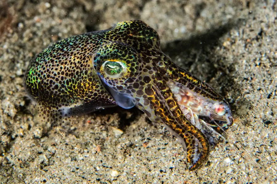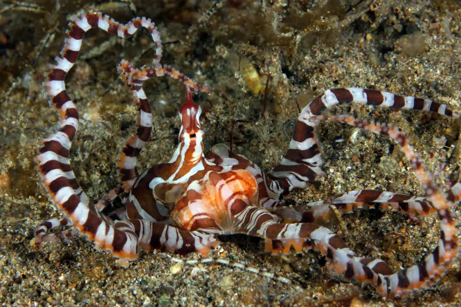 Muck diving is traditionally a dive site that has a sand or silty bottom. Although generally void of coral reefs, the seabed is far from barren. A multitude of interesting critters and creatures can be found in the sediment, often vibrant and poisonous. Anilao and Dumaguete’s dive sites have black and caramel sand, perfect for muck marine life to call the benthic zone their home. Cephalopods including mimic octopus, blue-ringed octopus, wonderpus and coconut octopus populate these waters alongside frogfish and ornate ghost pipefish.